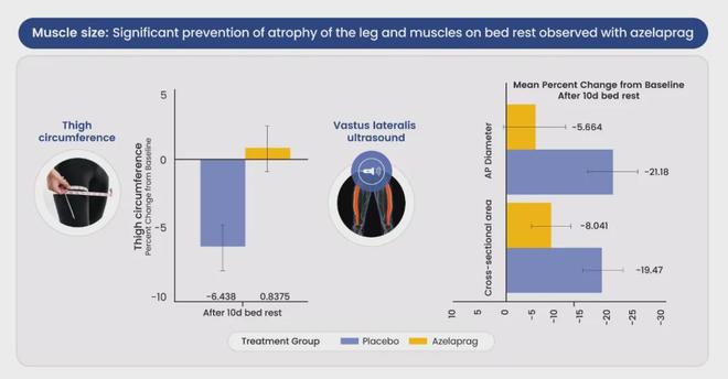 过去Azelaprag所展现出来的潜力实则不可小觑,在一项21名65岁健康老人增肌的临床试验中(其采用卧床休息10天来模拟肌肉和功能衰老,有研究表明该项举措可减少腿部瘦肉和降低氧化代谢水平),使用Azelaprag受试者未观察到大腿腿围或肌肉的显著减少,而安慰剂组受试者则观察到肌肉的显著减少,幅度大约在6-8%。