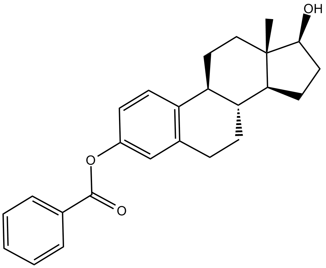 Estradiol Benzoate(β-Estradiol 3-benzoate)是一种雌激素类似物,可以与人源,鼠源以及鸡的ERα结合,IC50范围22-28 nM。