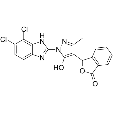 RU.521 (RU320521) 是一种有效的 dsDNA 和 cGAS 抑制剂,对 dsDNA 的 IC50 为700 nM。 RU.521 抑制 cGAS 介导的干扰素上调,抑制 dsDNA 依赖性激活。 RU.521 在环状 GMP-AMP 合酶介导的信号传导的细胞测定中具有活性和选择性,并且降低来自 Aicardi-Goutières 综合征小鼠模型的巨噬细胞中干扰素的组成型表达。