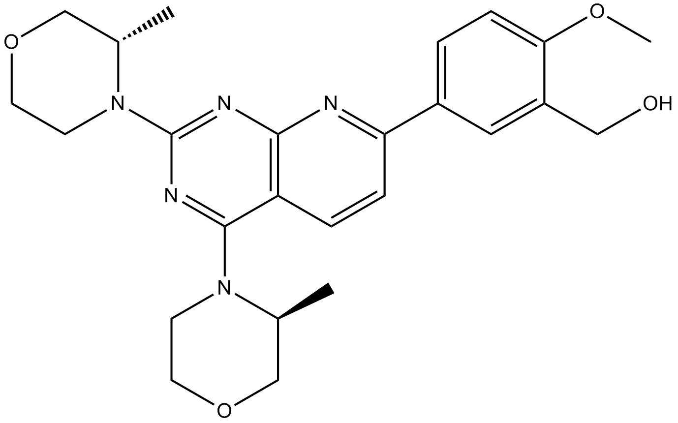 一种新型的,ATP竞争性mTOR抑制剂,在MDA-MB-468 细胞中IC50为0.8 nM,与作用于PI3K亚型和ATM/DNA-PK相比,具有优异的选择性(约1000倍)。AZD8055可诱导半胱天冬酶依赖的凋亡和自噬。Phase 1。