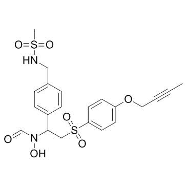 KP-457是一种选择性金属蛋白酶17(ADAM17)抑制剂,对ADAM17的选择性高于其他MMP和ADAM10,IC50为11.1 nM(ADAM17),748 nM(ADAM10),717 nM(MMP2),9760 nM(MMP3)分别为2200nM(MMP8),5410nM(MMP9),930nM(MMP13),2140nM(MMP14)和7100nM(MMP17)。 KP-457阻断ADAM17催化结构域的Zn2 +螯合。 KP-457(15μM)在iPSC衍生的血小板上保留GPIbα的表达[1]。